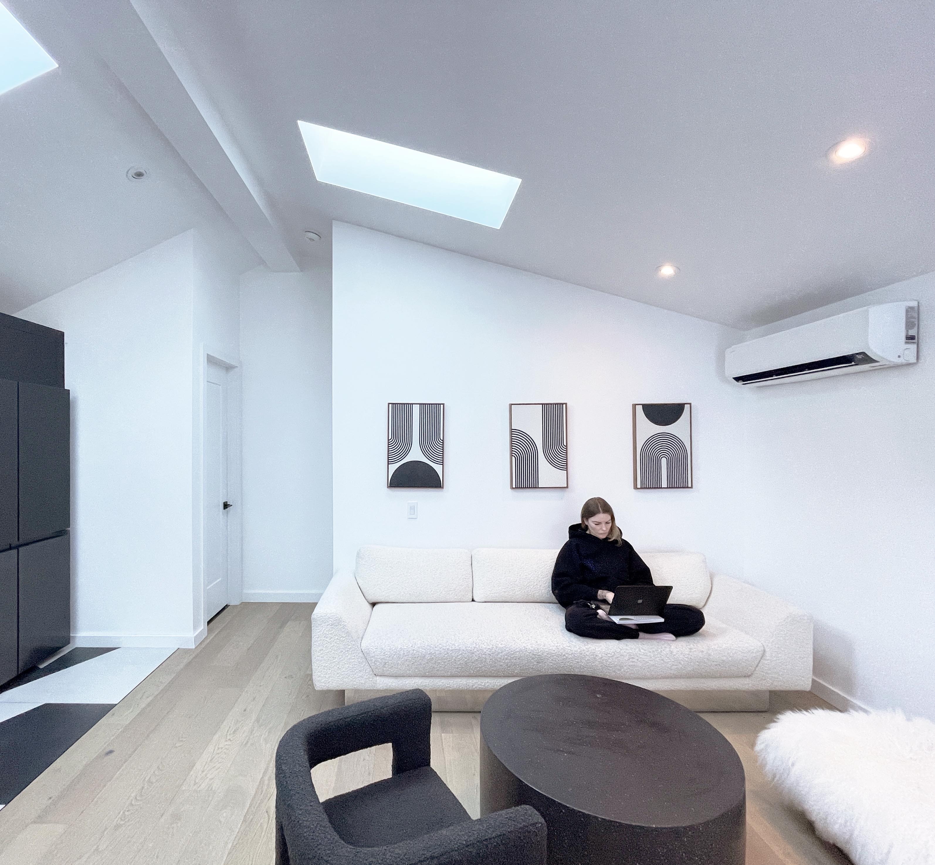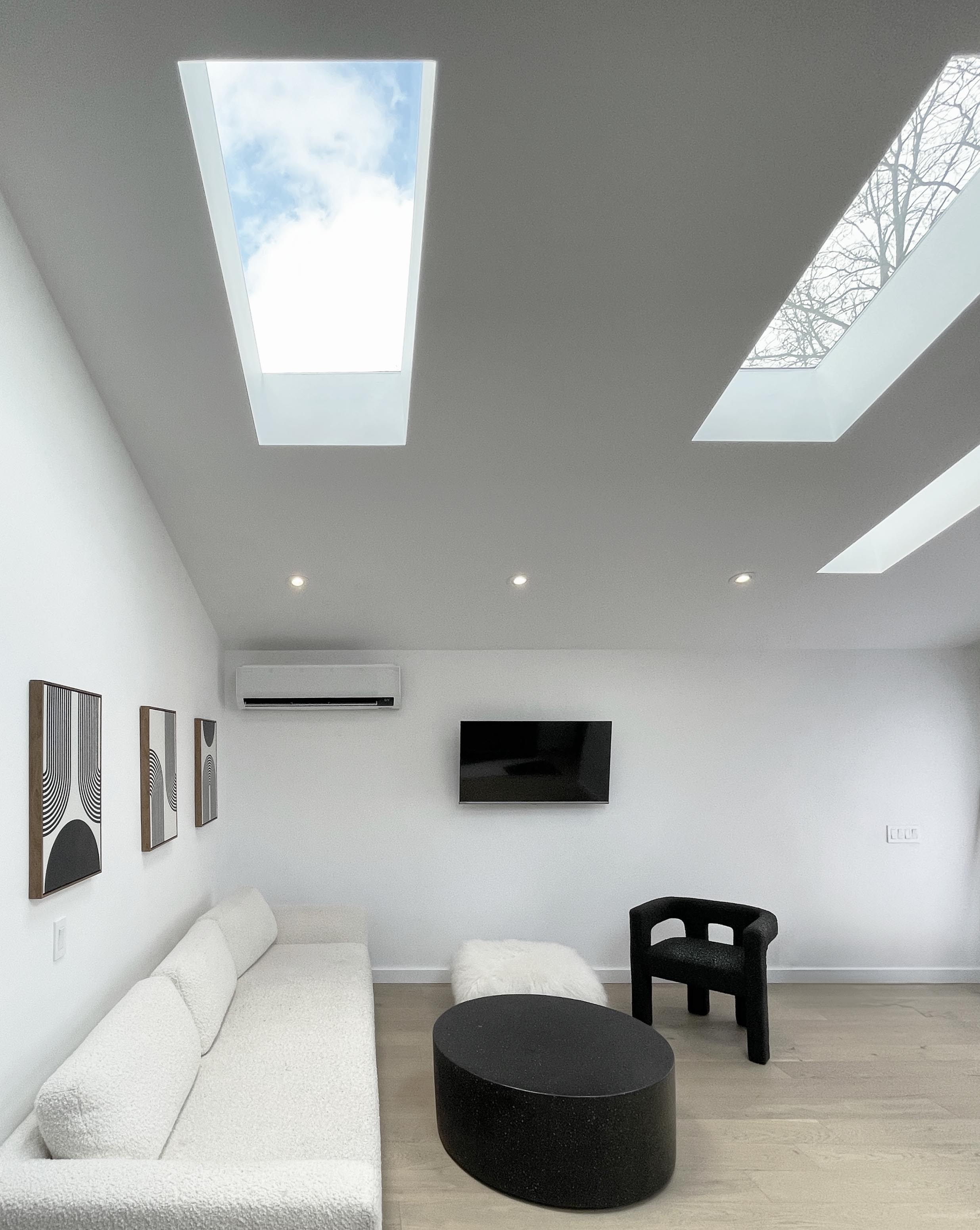 A curved facade and cantilevered terrace create some spatial drama in the shared space and make creative use of the city’s zoning limitations.